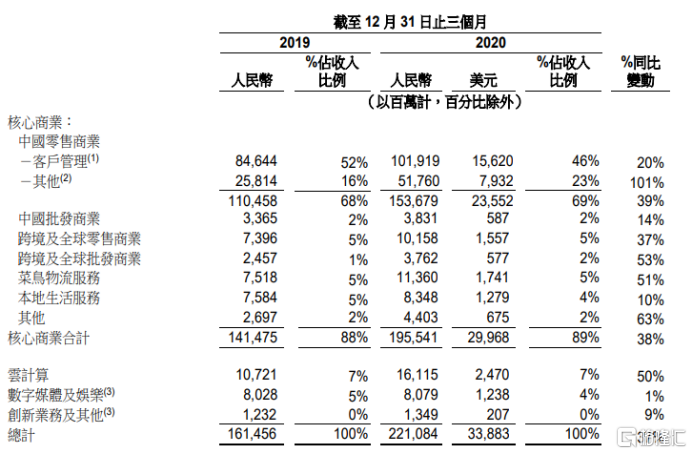 财报显示,阿里的经营利润率、经调整的EBIDA和EBITA利润率、经调整的核心商业的EBITA均有3至4个百分点的下降。作为目前核心利润和主要现金流来源的客户管理收入增速20%,大幅低于37%的整体收入。