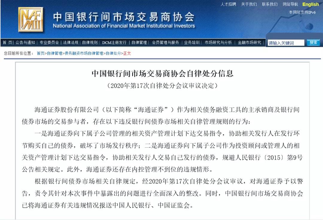 2021年1月8日,中国银行间市场交易商协会发出了四张自律处分信息,涉及主体分别为海通证券、海通资管、海通期货和东海基金。