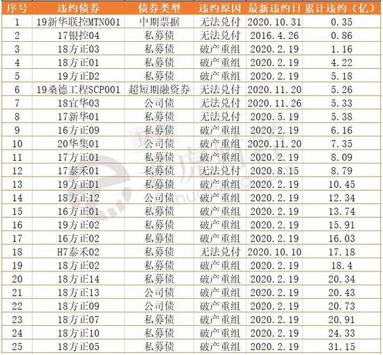 具体来看,违约债券来自宜华企业1只、桑德环境工程1只、华晨汽车1只,大新华航空1只、新华联控股公司1只、泰禾集团2只、宁波银亿控股1只和北大方正集团17只。