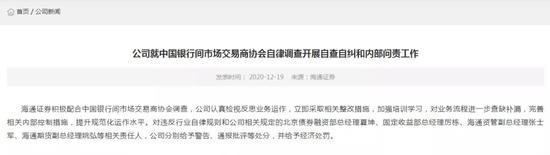 12月19日,海通证券官网公司新闻栏,发布了一则题为《公司就中国银行(维权)间市场交易商协会自律调查开展自查自纠和内部问责工作》的公告。