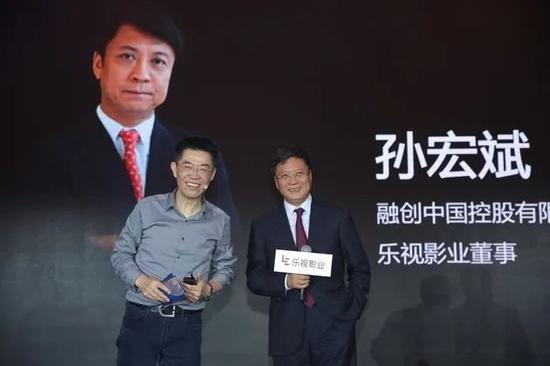 张昭与孙宏斌合影,场景为2018年乐创文娱发布会