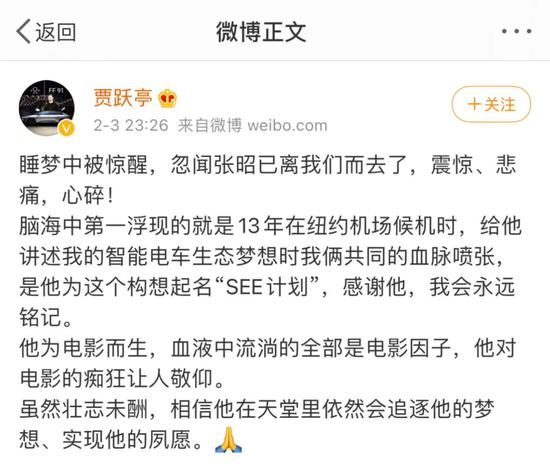 贾跃亭发微博悼念,“他为电影而生,血液中流淌的全部是电影因子”。