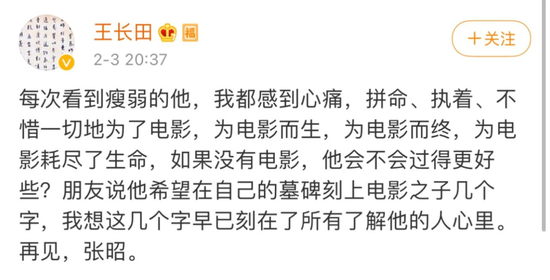 王长田发微博悼念,张昭“为电影而生,为电影而终,为电影耗尽了生命”。