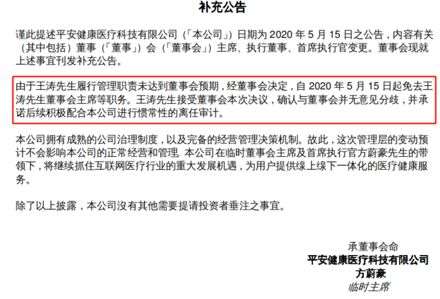 5月19日晚间,平安好医生对董事长兼CEO王涛被免职一事作出补充公告。公告表示,由于王涛履行管理职责未达到董事会预期,经董事会决定,自2020年5月15日起免去王涛董事会主席等职务。