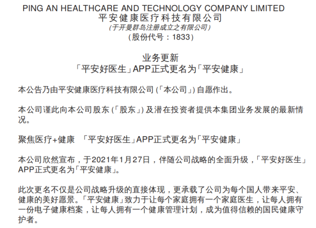 1月27日,平安好医生的运营商“平安健康互联网股份有限公司”发布公告称:“平安好医生”APP正式更名为“平安健康”。公告称,更名是公司战略升级的直接体现。