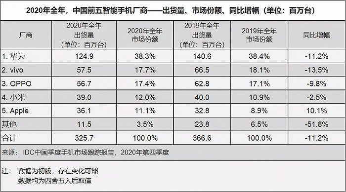 在国内市场,IDC数据显示,2020年全年中国智能手机出货量约3.26亿台,同比下降11.2%,vivo以5750万台出货量、17.7%市占率位列第二,仅次于华为。
