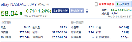 周四美股盘前,eBay大涨9.53%,报63.57美元,该公司第四季度及全年业绩超出市场预期,GMV超1000亿美元。