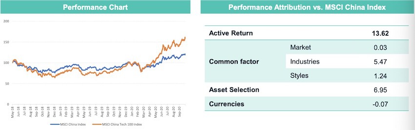 MSCI亚太区研究部主管魏震称,根据指数的回测表现来看,在2018年5月31日至2020年10月30日期间,MSCI中国科技股100指数的表现比母指数(MSCI中国指数)高出13.6%,其中一半的超额收益来源于有利的行业和风格因子。另一半的超额收益则可归因于资产选择,即这部分表现不能归因于任何行业或风格因子,但可以归因于特定股票的敞口,“主动选股”愈发重要。