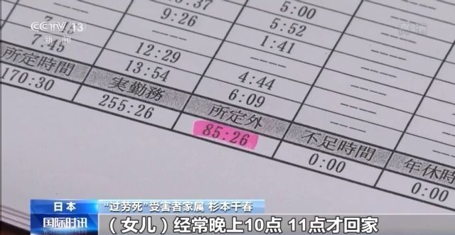 “过劳死”受害者家属杉本千春:这个是(2012年)8月,加班85个小时。(女儿)经常晚上10点、11点才回家,之后继续工作,每天只睡两三个小时。工作的计时卡显示每天都加班,入职第2个月加班90多个小时,我觉得是过度劳累。