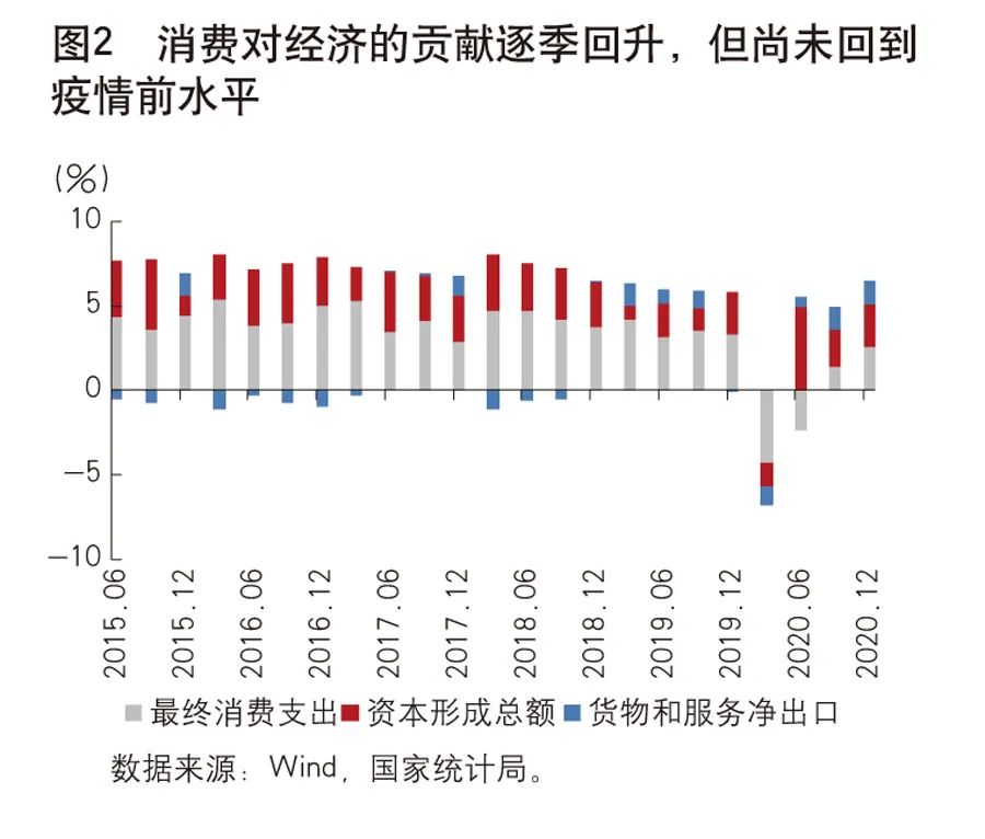 消费对经济的贡献逐季回升,但尚未回到疫情前水平。2020年疫情冲击下,逆周期政策快速发力,率先启动了地产和基建两大引擎,叠加出口超预期,使得经济快速企稳。但是,结构性的对冲政策背景下,经济也表现出结构性的复苏态势,投资较强,消费较弱。全年来看,消费对经济增长贡献为负,是1978年以来的首次,其中,拖累主要发生在第一、第二季度。第三季度以后,随着经济重启,居民消费持续改善,网上购物等新型消费模式也对冲了一部分线下消费受到的冲击,消费对经济增长的拉动作用逐季回升,第三季度和第四季度消费对经济增长分别贡献1.4%及2.6%。但是,居民消费对经济的拉动作用,尚未回到疫情前水平,仍有较大的提升空间,第四季度消费对于经济增长贡献率为39.6%,而这一数字在过去五年均值约为61%。