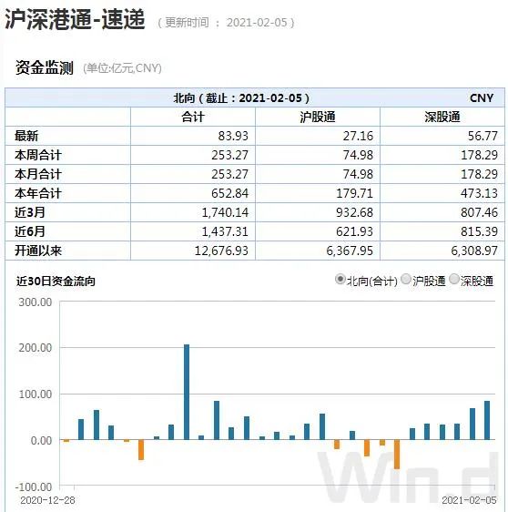 2月5日,北上资金净流入83.93亿元,本周净流入253.27亿元。本周市场整体呈现冲高回落的走势,在市场下跌时,北上资金反而加大了买入力度。