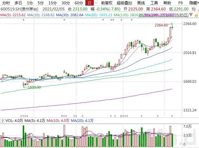 除银行外,白酒板块依旧炙手可热。对于茅台的抱团市场已经争论已久,但并不妨碍茅台股价继续新高。截至2月5日收盘,贵州茅台盘中一度大涨近2%,突破2360元/股,当前总市值突破29000亿元,距离3万亿关口仅一步之遥。