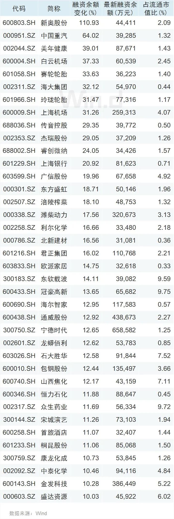 具体来看,新奥股份融资余额增幅达110.93%,位居第一;此外,中国重汽、美年健康、白云机场、赛轮轮胎、海大集团、玲珑轮胎、上海机场、传音控股、杰瑞股份、睿创微纳、上海银行等公司融资余额增幅均超过20%。