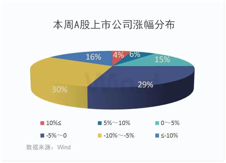 从本周全部A股以来涨幅情况来看,有188只个股涨幅超过10%,占比4%;有233只个股涨幅在5%到10%之间,占比6%;614只个股涨幅在5%以内,占比15%;此外有3100多只个股本周下跌,占比75%;同时跌幅超过5%的个股占比达46%。