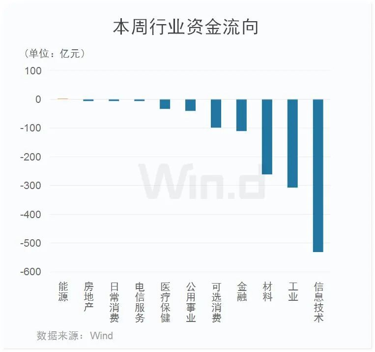 从本周行业资金流向来看,主力资金净流出1400多亿元,其中信息技术板块净流出超500亿元,位于首位;工业和材料板块净流出金额亦较高,均超200亿元;仅能源板块微幅净流入。
