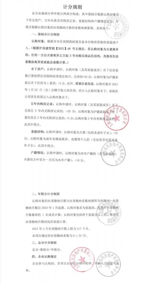 2月6日上午,证券时报记者在上海闵行区新盘“建发浦上湾”认筹现场看到,该楼盘已贴出“认筹计分规则”,拟认购对象总组数与准售房源套数比例超过1.3:1,启动计分排序程序,按照家庭、户籍、一定年限的购房记录、社保缴纳年限等计分后,分数由高到低,按认购组数与准售房源套数1.3:1的比例确定入围分数线,达到入围分数线的,纳入公正摇号名单。