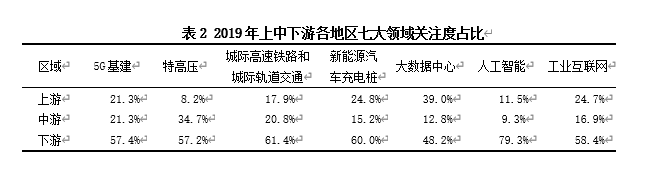 2019年长江经济带新基建七大领域关注度占比上中下游各有侧重,下游地区对7大领域关注度普遍较高