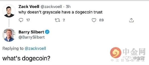 灰度创始人回复推特网友称不知道狗狗币,就推特网友有关“为什么灰度没有狗狗币(dogecoin)信托基金”的提问,灰度创始人、前首席执行官Barry Silbert回复称:“狗狗币是什么?”。