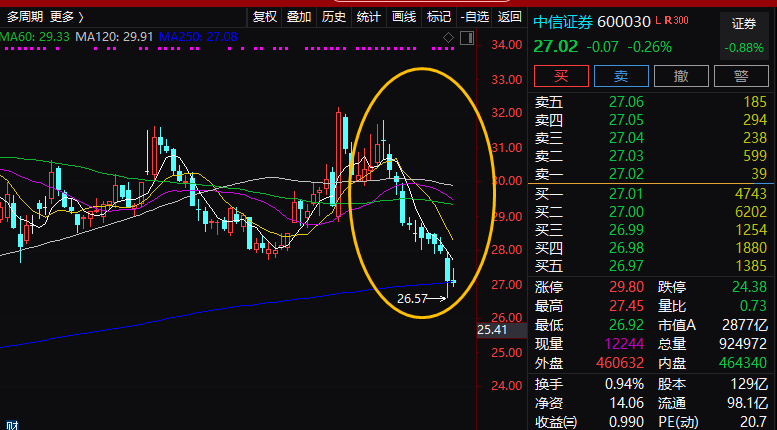 从个股来看,牛市旗手券商股近期表现较差,比如中信证券持续杀跌11天。