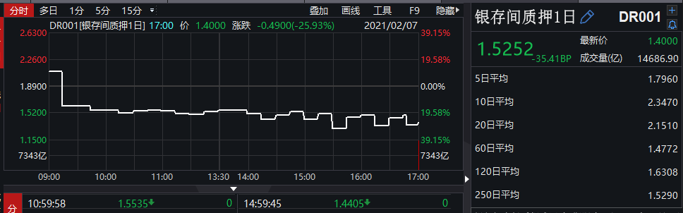 不过,周末央行又突施雨露。据人民银行网站,为维护春节前流动性平稳,2021年2月7日人民银行以利率招标方式开展了500亿元14天期逆回购操作。因当日无逆回购到期,当日实现净投放500亿元。在此操作的加持之下,银行间同业拆借隔夜利率大幅杀跌,银行间1天期的回购利率亦大跌。春节还剩最后三个交易日,是否还有戏?