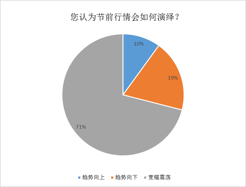 对于A股市场春节前及节后开局一段时间的表现,目前私募业内对于股指的整体研判,大体仍定调为“震荡行情”。相关问卷调查同时显示,有71%的私募表示更倾向于市场将在节前延续宽幅震荡格局。此外,有19%的私募认为节前市场趋势或将向下,10%的私募认为节前市场有望明显走强。