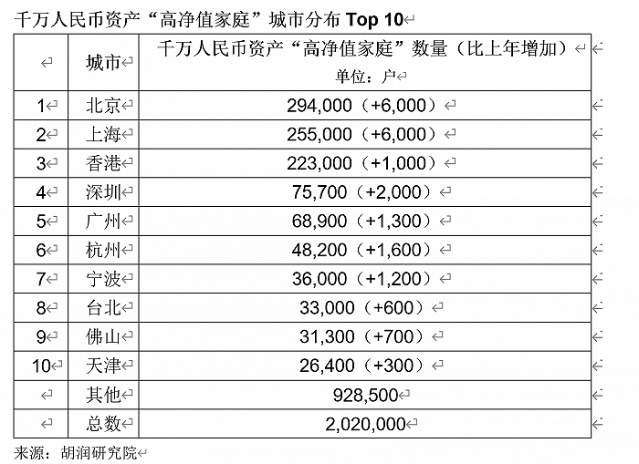 图片来源:胡润研究院再来看千万资产家庭的地区分布。报告发现,北京仍然是拥有最多千万人民币资产“高净值家庭”的地区,比上年增加6,000户,达到29.4万户,增长2%,其中拥有千万人民币可投资资产的“高净值家庭”数量有14.9万户;广东第二,千万人民币资产“高净值家庭”比上年增加6,000户,达到29.1万户,增长2.1%,其中拥有千万人民币可投资资产的“高净值家庭”数量有16.5万户;上海第三,千万人民币资产“高净值家庭”比上年增加6,000户,达到25.5万户,增长2.4%,其中拥有千万人民币可投资资产的“高净值家庭”数量有14.6万户。
