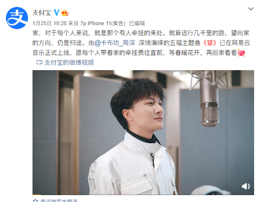 家,对于每个人来说,就是那个有人牵挂的来处。就算远行几千里的路,望向家的方向,仍是归途。由@卡布叻_周深 深情演绎的五福主题曲《望》已在网易云音乐正式上线,愿每个人带着家的牵挂勇往直前,等春暖花开,再回家看看