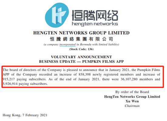恒腾网络昨日公告,旗下南瓜电影APP一月新增注册会员85.8万人,新增付费会员91.5万人。截至1月末,南瓜电影累计注册会员3610.7万人,付费订阅用户592.7万人。