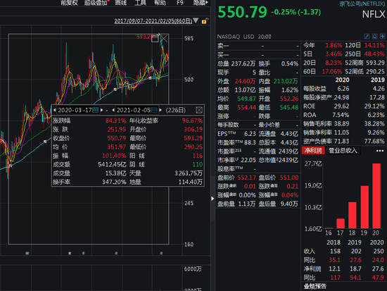 用户激增下,奈飞股价也在近期创出近600美元的历史新高,随后震荡回落至550美元左右。wind数据显示,奈飞从2020年3月至今股价涨超84%。最新市值2439亿美元(近1.6万亿元人民币)。