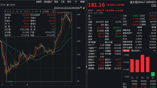 同时,在二级市场上,迪士尼的股价也在去年熔断后迅速反弹,并在近期闯出历史新高。wind数据显示,迪士尼从2020年3月至今股价最高早已翻倍,最新市值3280亿美元(2.1万亿元人民币)。