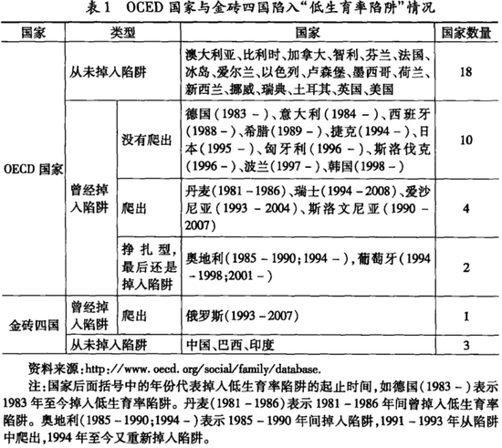 南京大学社会学院教授陈友华等人在2015年研究OECD(经合组织)和“金砖四国”过去30年的总和生育率后,总结了一组数据: