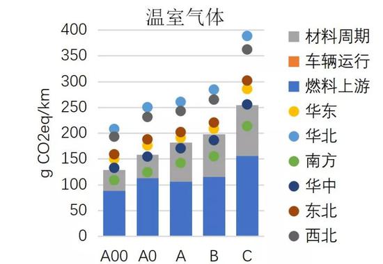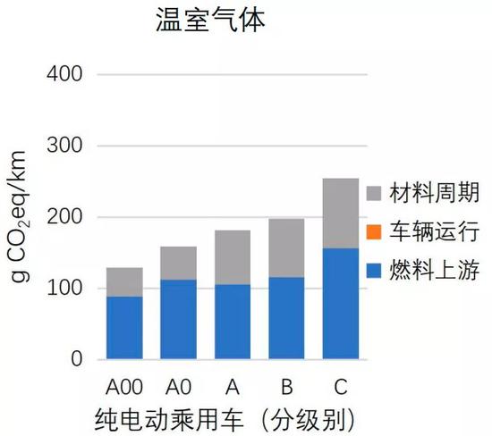 上述《汽车生命周期温室气体及大气污染物排放评价报告2019》表明,假定所有车辆均在全国平均电力情况下生产、组装、使用,从车辆级别角度来看,无论是对于汽油乘用车或是纯电动乘用车,A00级别车辆均具有最小的温室气体排放因子,随着车辆级别的增加(从A00至C),全生命周期的温室气体排放水平依次增加,这是由于较高级别车辆的燃料周期和材料周期温室气体排放水平均高于低级别的车辆。