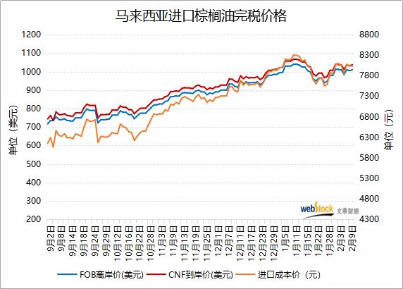 2月9日马来西亚棕榈油离岸价为1010美元,较上日涨5美元,进口到岸价为1037美元,较上日涨5美元,进口成本价为8037.42元,较上日涨0.87元。受1月供应疲弱的预期以及2月出口好转的希望提振,马来西亚BMD毛棕榈油期货周一上涨近2%,棕榈油进口成本跟盘上涨,但涨幅明显弱于期货盘面。