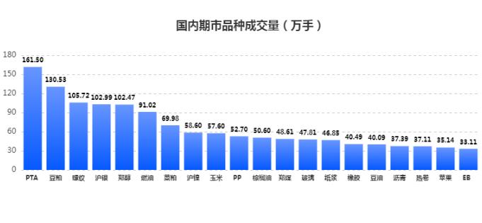 品种行情仍然不缺看点,但投资者交投热度仍在降温,多品种成交量出现下滑。化工品中PTA大幅减仓,成交量微增至161万以上,升至榜首。豆粕、螺纹仍然在成交量前三行列,不过成交量分别降至130万手和105万手附近。值得一提的是刷新阶段性高位的沪铜成交量明显增加,由昨日的不及19万手升至近28万手。
