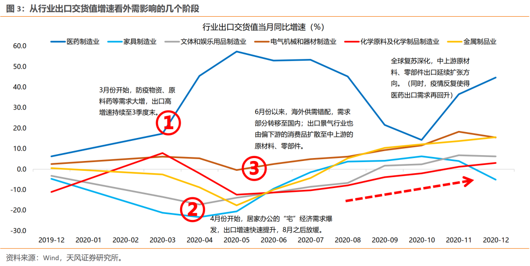 ① 防疫经济:2020年3月份开始,防疫物资、原料药等需求大增,典型的比如医药制造业,其出口高增速持续至3季度,呈现“倒V型”需求形态。但年底全球疫情的反复也使得防疫物资的出口增速出现一定程度的反弹。