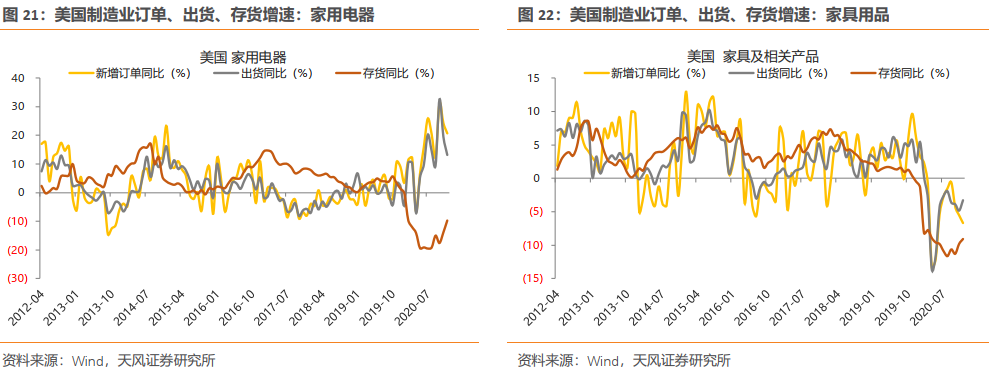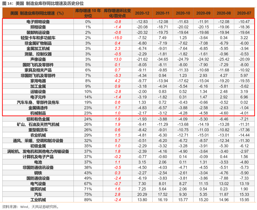 (1)2021年,海外补库需求体现在复苏驱动的原材料和零部件。美国制造业的库存水平目前整体仍处低位,有一半左右行业的库存增速仍在历史20%分位下方。结合库存水平、订单增速来,补库需求较强的行业有两类:一是订单回升、库存低位的中上游原材料及加工机械。比如:铝和有色、金属铸造件、矿山石油机械、装卸转运设备、通风采暖空调和制冷设备、金属加工机械等;二是订单回升、库存低位的中下游元器件及成品。比如:电气设备和组件、家电电器、家具、汽车车身及零部件、电子元件等。
