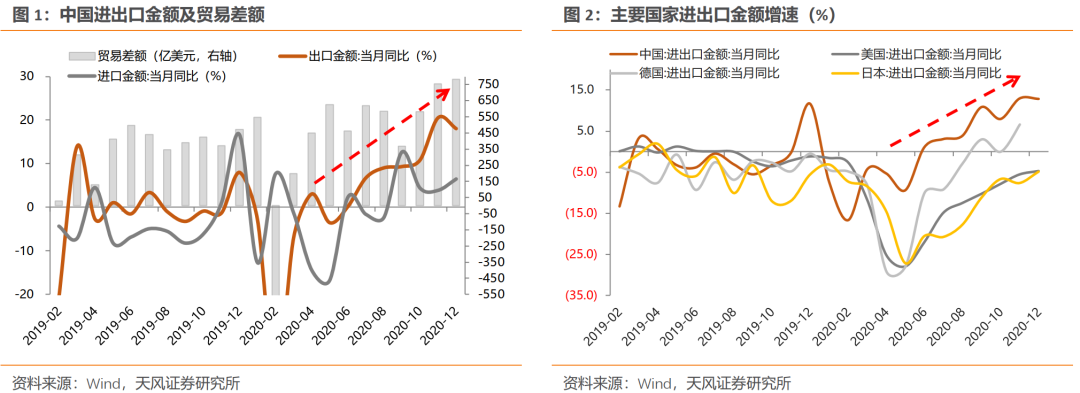 2020年,我国的出口增速在疫情冲击下,有过短暂的下滑,之后便一路上行。特别是四季度以来,出口增速显著提升(11月、12月当月出口金额增速提升至20.6%、18.1%),在全球的贸易结构中,一枝独秀。