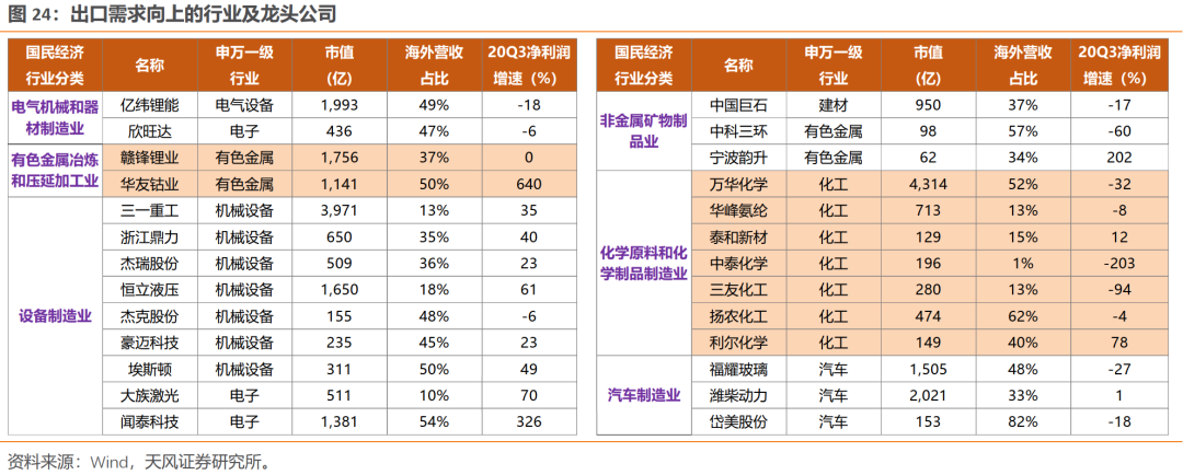 展望2021年,出口景气,从“顺全球需求周期”到“顺全球供给周期”。那么,对于国内的出口端行业来说,中上游原材料、生产零部件等行业的出口增速将继续扩张。