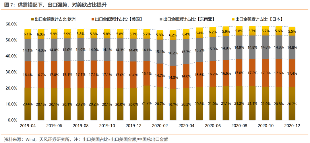 因此,在疫情影响下,海外供需错配,中国出口强劲,对美、欧出口占比均显著提升。