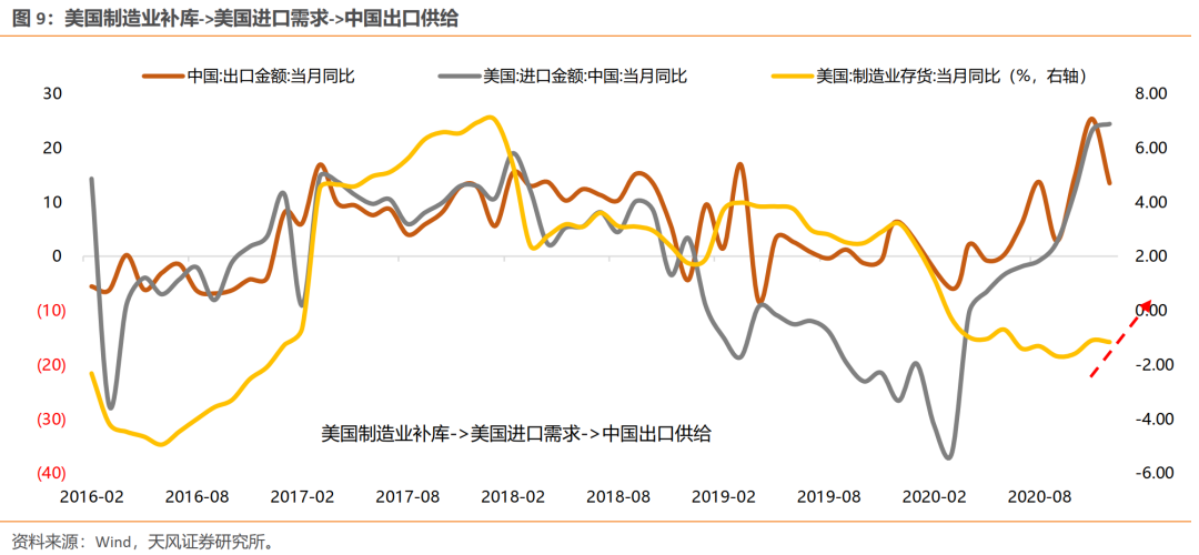 (1)从历年美国制造业补库的需求传导,有如下规律:美国制造业补库->美国进口需求->中国出口供给。
