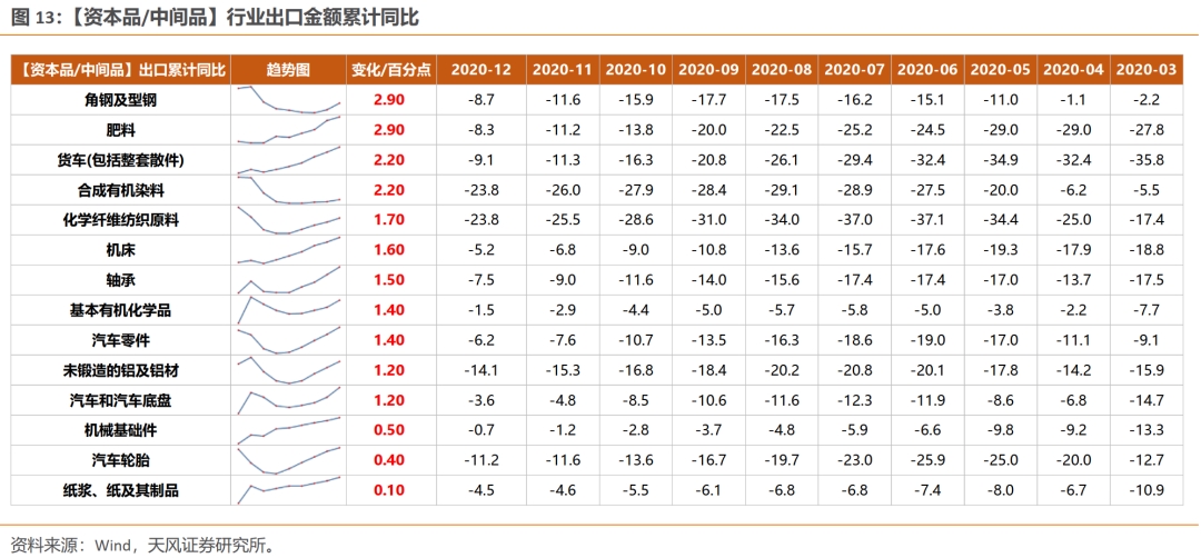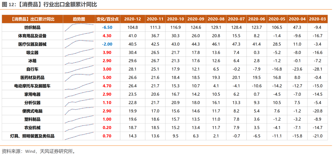 2020年出口金额累计增速高的行业有三类:①防疫物资相关的商品,如纺织制品、医疗仪器及器械等;②景气足够高的细分行业,如新能源汽车;③下半年需求快速恢复且有海外替代效应的商品,主要是偏向于整机、成品类的消费品,如家用电器、体育用品、摩托车等。