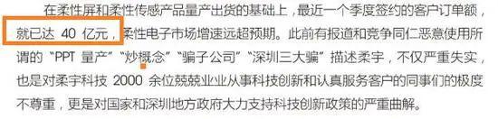 值得注意的是,为回应“PPT量产”“骗子公司”等质疑,柔宇科技曾发布超5000字声明,并称“最近一个季度签约的客户订单额,就已达40亿元,柔性电子市场增速远超预期。”但招股书中却丝毫未见这40亿的订单,公司的总营收也仅在2亿元左右。