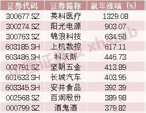 从个股表现来看,在剔除鼠年上市新股后,全年A股共有超过1400只股票收涨,占比37.48%,其中246只股价翻番。英科医疗以1329.08%的涨幅,成为庚子鼠年最牛个股,阳光电源、锦浪科技、上机数控庚子鼠年涨幅均超过600%。