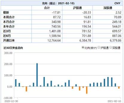 值得注意的是,“聪明钱”今日选择了离场。Wind数据显示,2月10日,北向资金终结了此前连续8个交易日净流入状态,全天净流出17.81亿元。2021年以来,北向资金累计净流入740.56亿元。