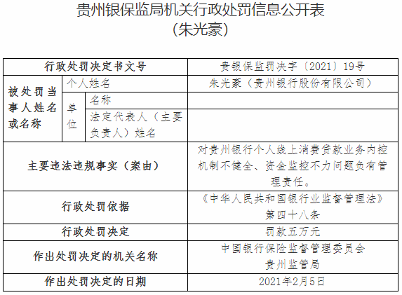 原标题:贵州银行违法遭罚 个人线上消费贷款内控机制不健全