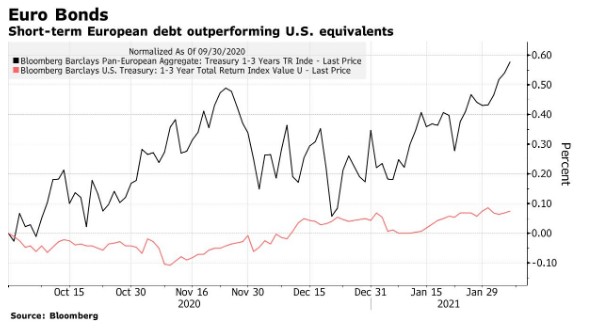 目前,市场上这种分歧正在显现,具体反映到了债市上。近几个月来欧洲短期债券的表现优于美国同行。自9月底以来,媒体巴克莱指数衡量的1-3年期欧洲政府债券的价格上涨了近0.60%,而同期美国国债的上涨幅度仅为0.1%。