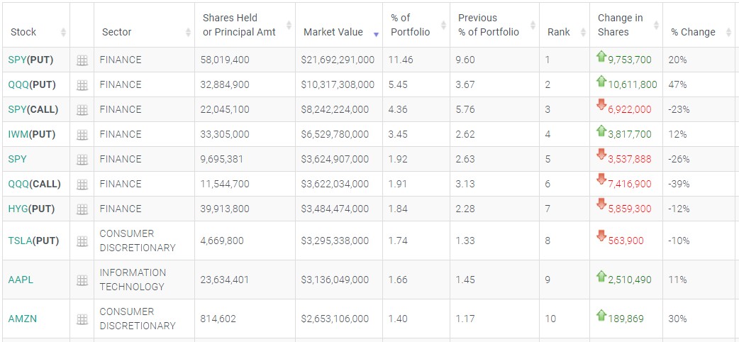 从持仓比例变化来看,前五大买入标的分别是:标普500指数(PUT)、纳指100ETF(PUT)、罗素2000指数ETF PUT(IWM.US)、房地产指数ETF-iShares道琼斯(IYR.US)、特斯拉 CALL (TSLA.US)。