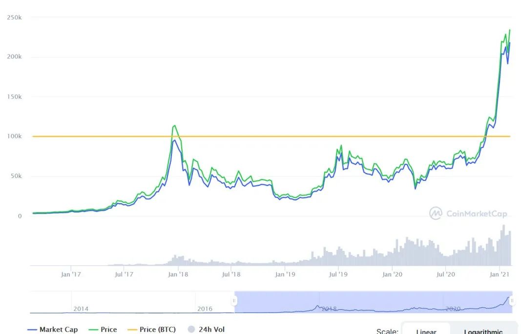 2月4日,马斯克在推特上表示:“狗狗币是人民的货币。”并且发了一张狮子王的配图,把狮子王辛巴的头换成了狗头。韩当入手时,狗狗币的价格还在1分钱左右,而目前价格为0.47元/个。炒币多年,无心插柳,这成为他遭遇的第一个10倍币。
