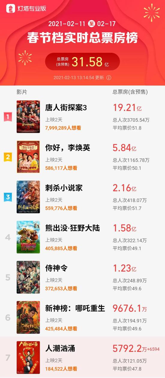 票房方面,春节档首日,中国电影票房超17.36亿,观影人次超3451万,刷新全球单日票房纪录,打破了2019年大年初一创下的中国影史单日14.58亿票房纪录,刷新单日观影总人次纪录,创造春节档首日票房新纪录。