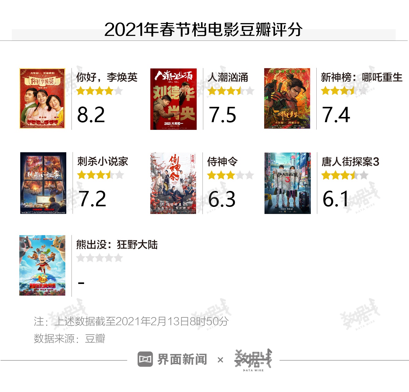 从影片评分来看,截至2月13日8时50分,7部春节档影片,除《熊出没:狂野大陆》暂未有评分外,豆瓣评分最高的是《你好,李焕英》(8.2分),最低的是《唐人街探案3》,仅为6.1分。